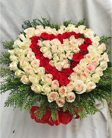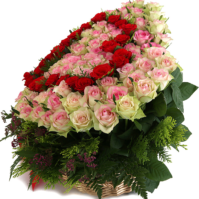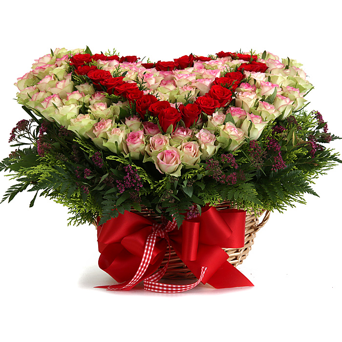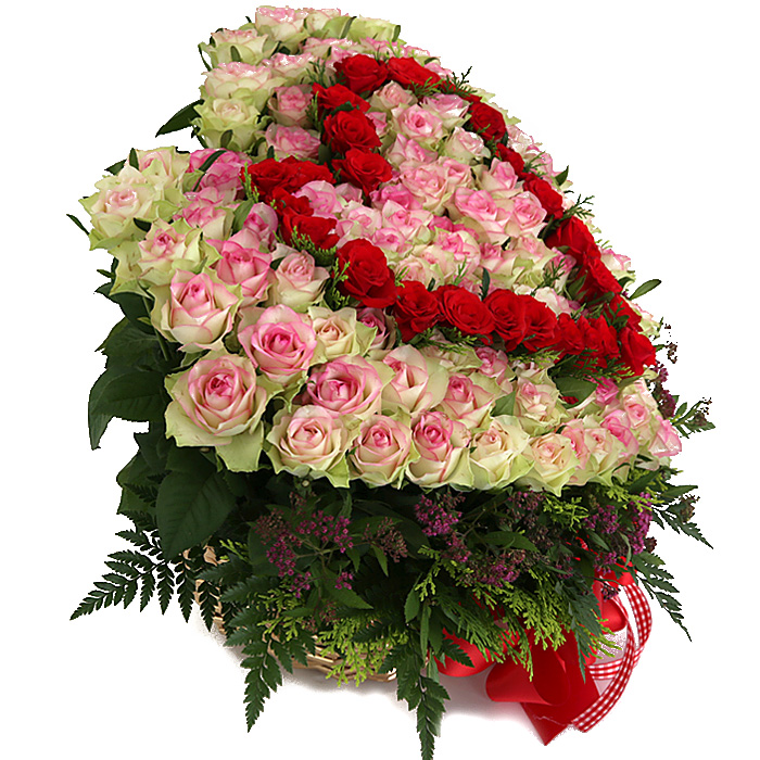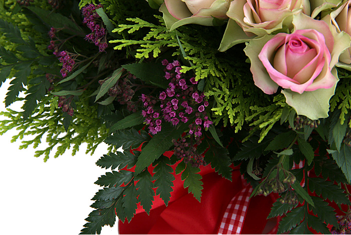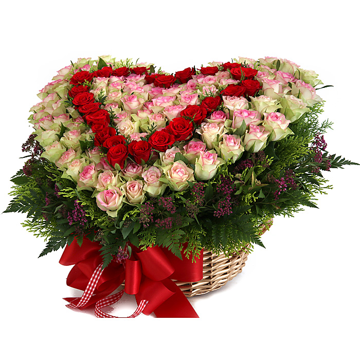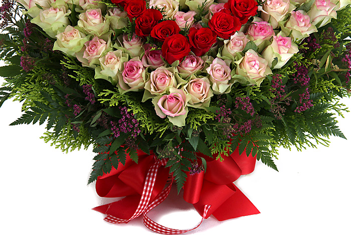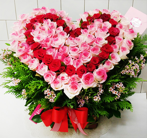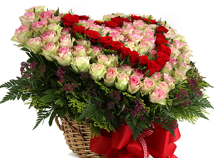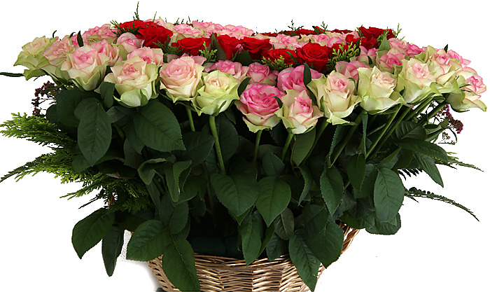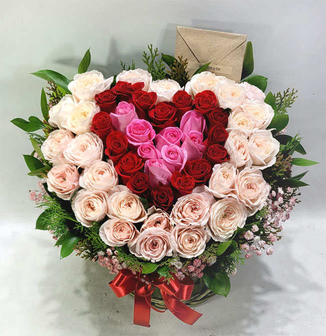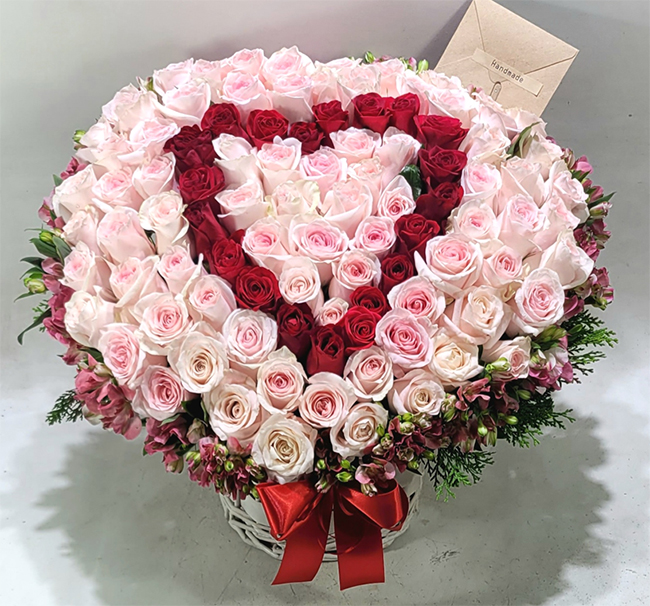 연핑크장미, 레드장미, 그린소재, 수제바구니, 리본 또는 카드.