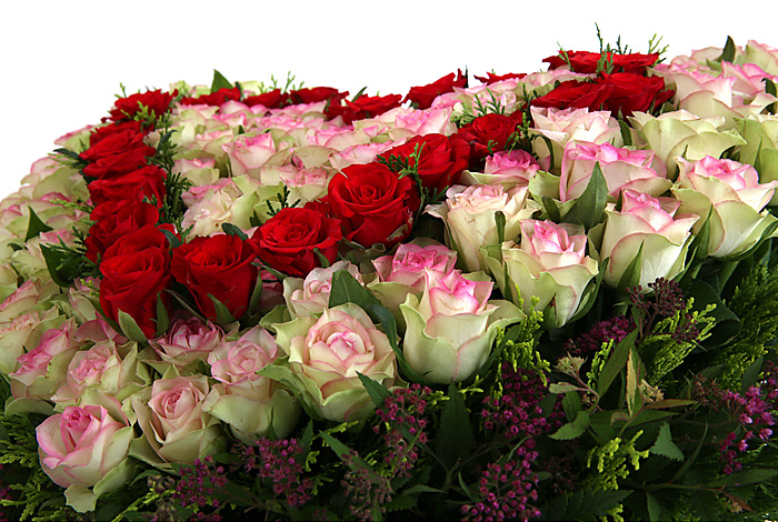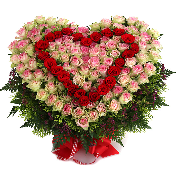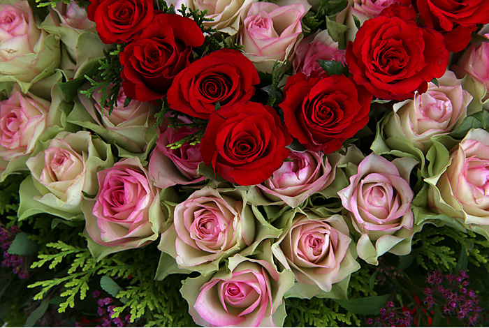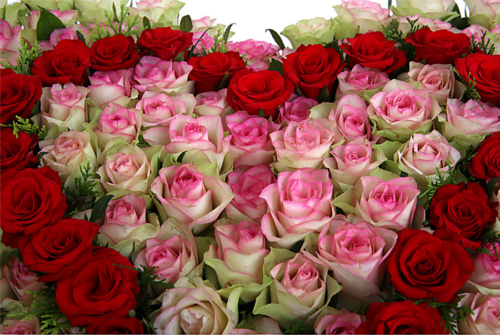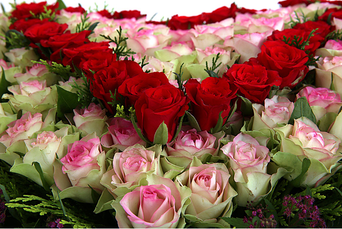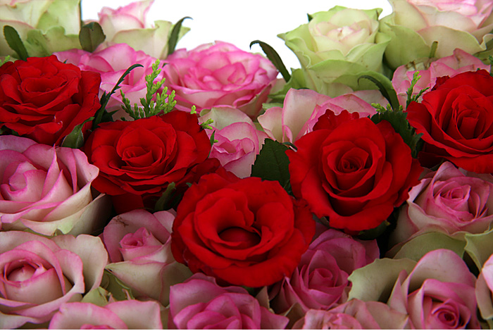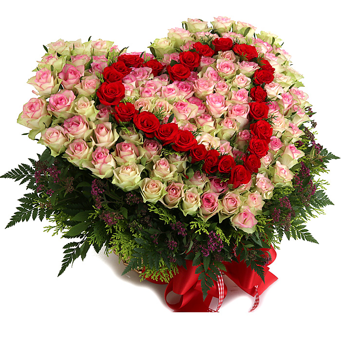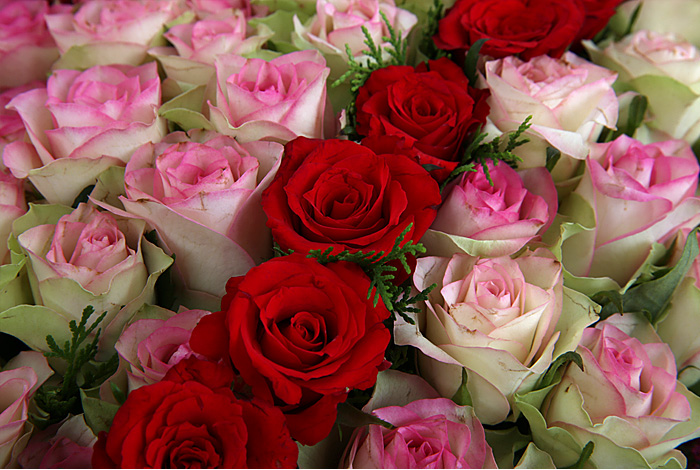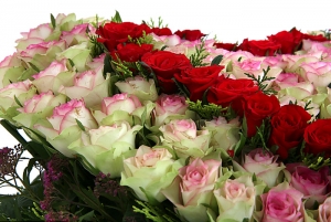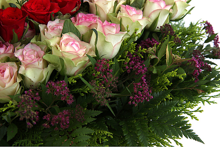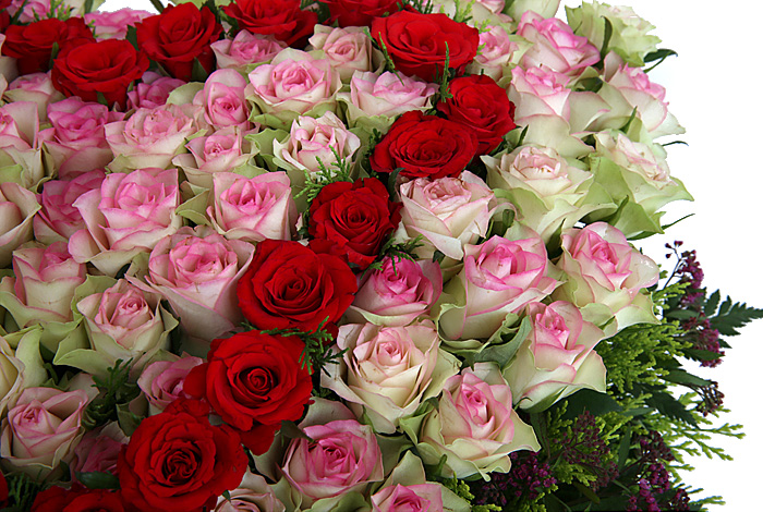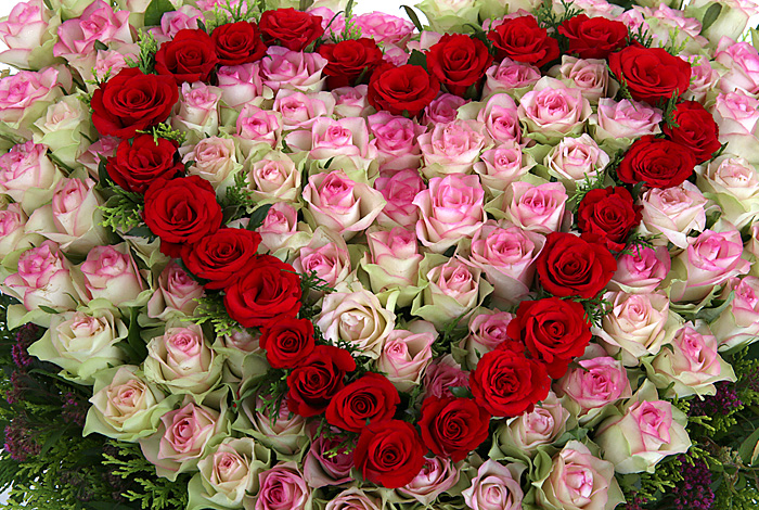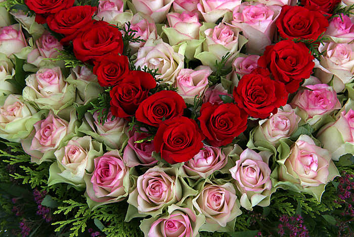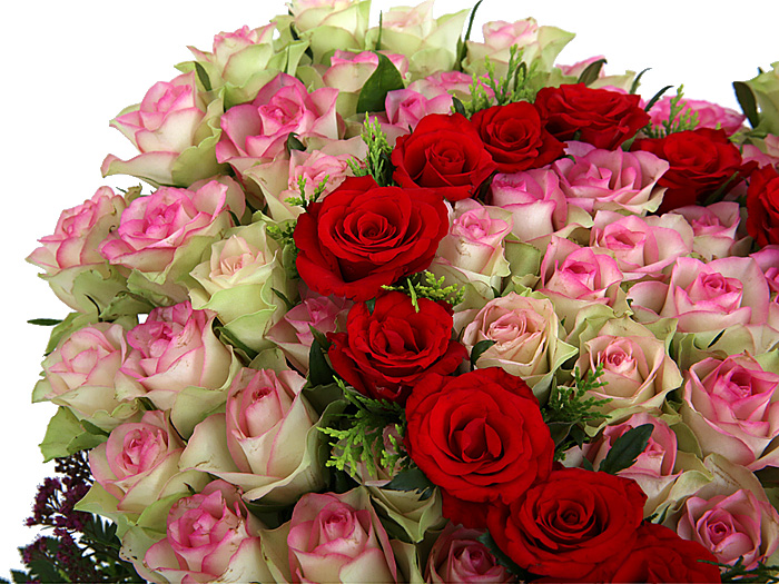 연핑크장미, 레드장미, 그린소재, 수제바구니, 리본 또는 카드.