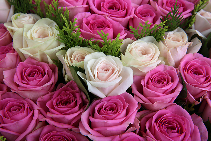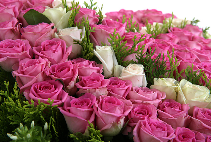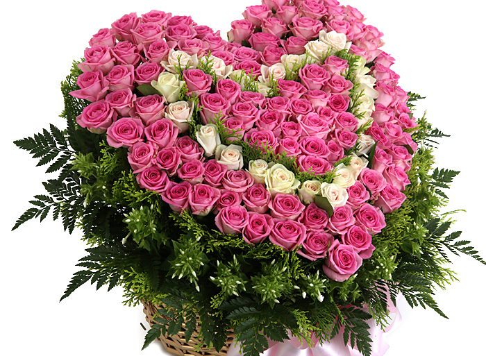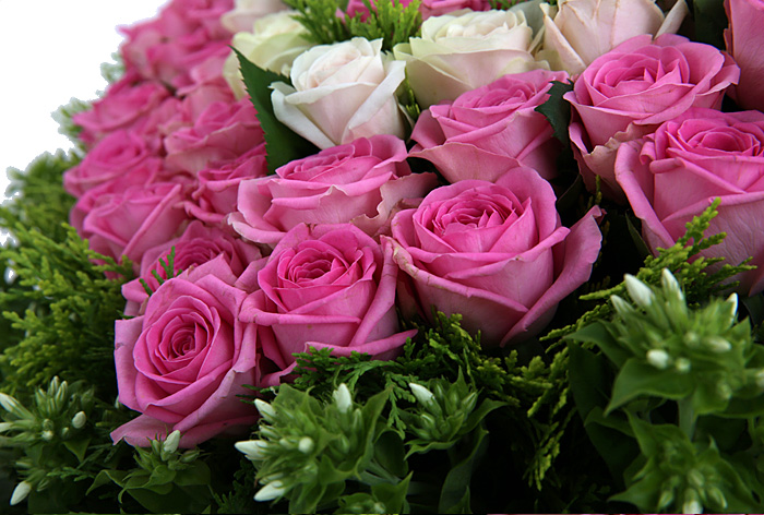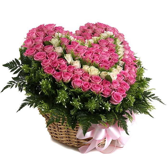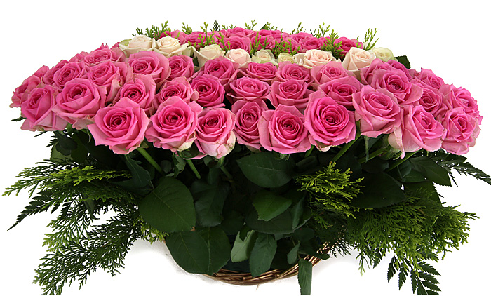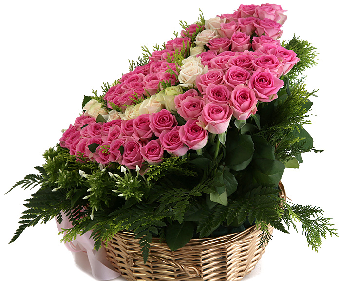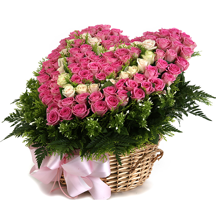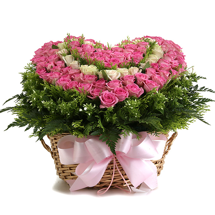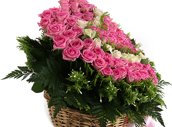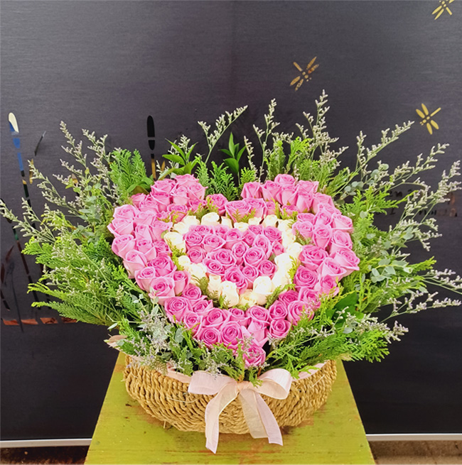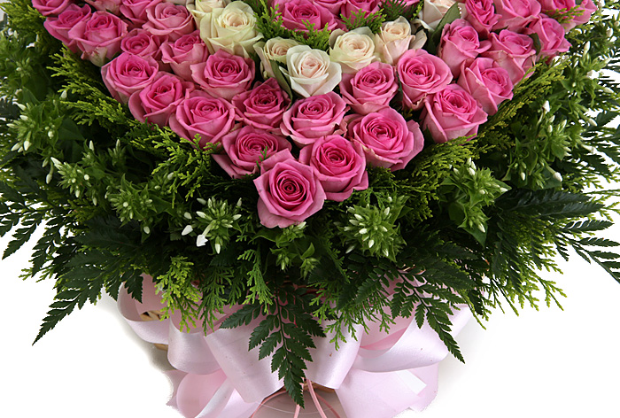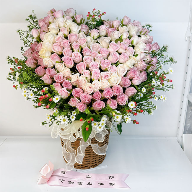 백장미, 핑크장미, 그린소재, 수제바구니, 리본 또는 카드.