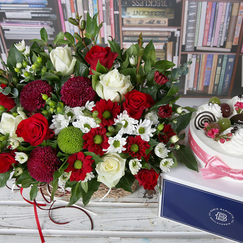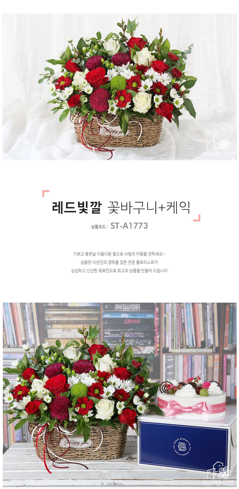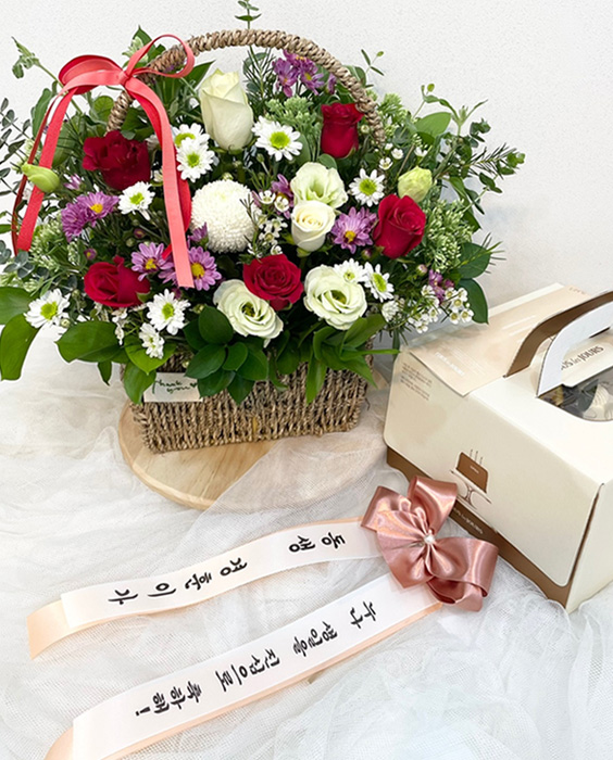 레드빛깔 꽃바구니+케익