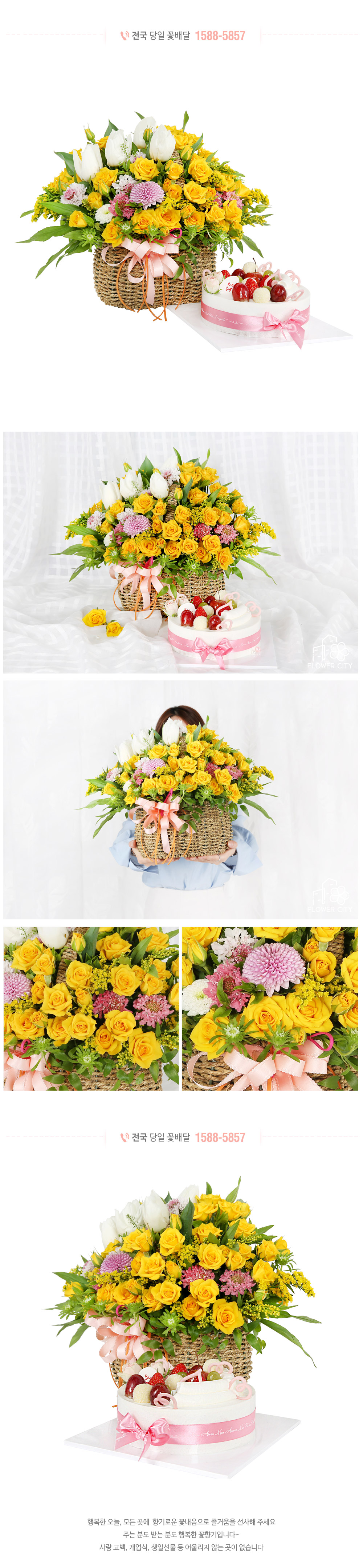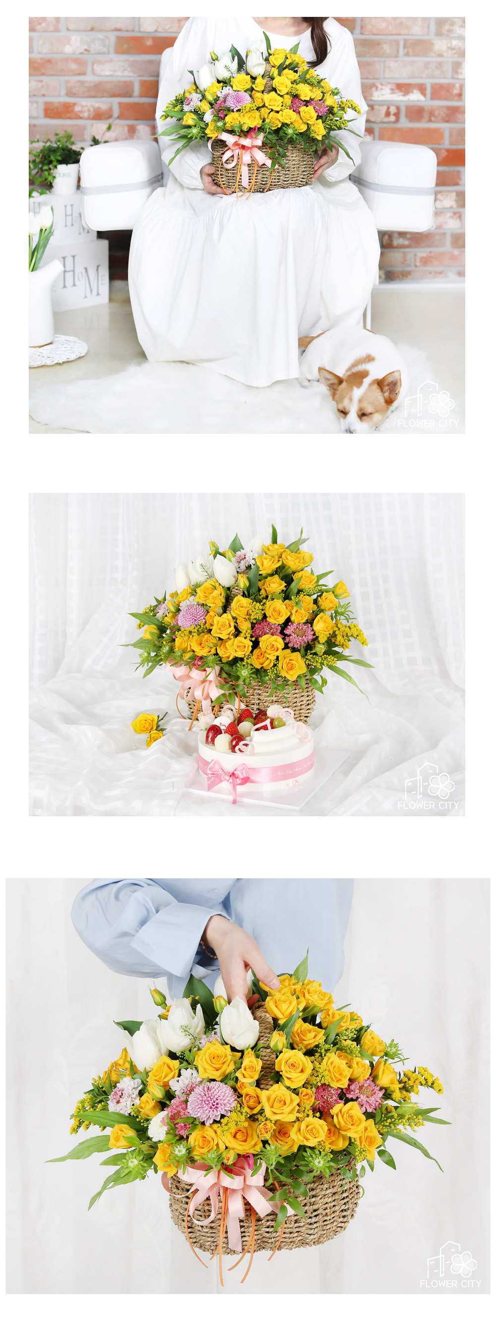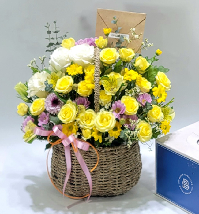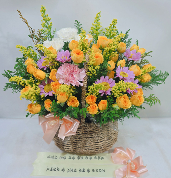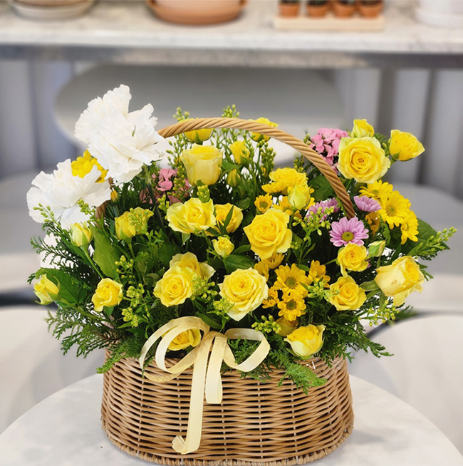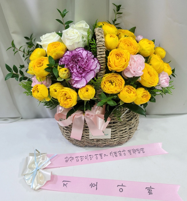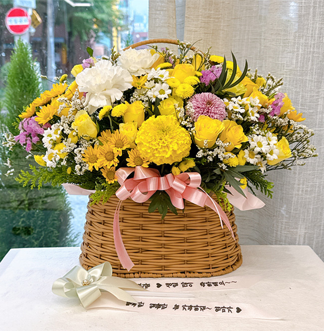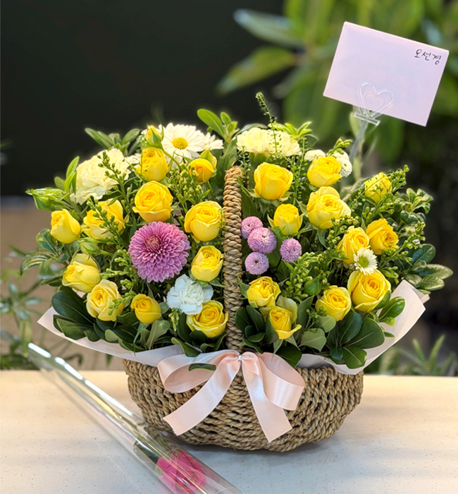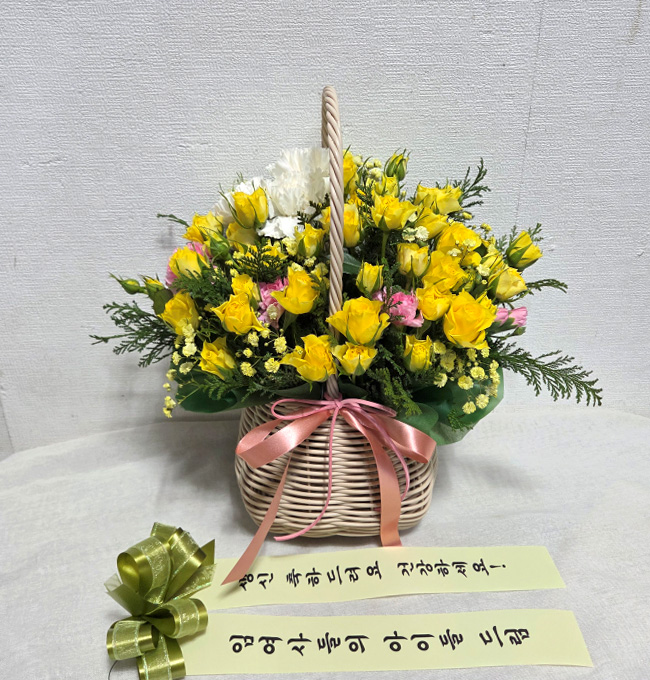 노란 장미가 가득한 바구니 구성이 정말 화사하고 예쁘게 도착했어요!
