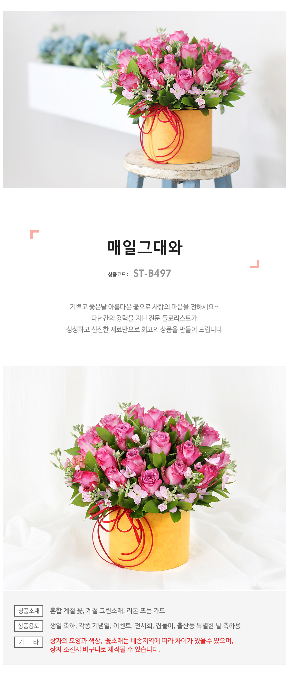 ★ 상자의 모양과 색상은 배송지역에 따라 차이가 있을 수 있으며, 상자 소진 시 바구니로 제작될 수 있습니다.